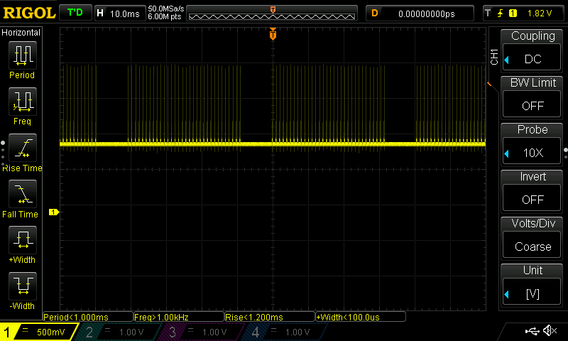 Taking a closer look at these pulses reveals that the width of the pulse is about 125us with an approximate 875us for a total cycle of ~1ms. After 32 cycles there is a 9ms resting period which would be the ideal time to read the distance sensor but again, there’s no way of knowing exactly when this period is. Unfortunately, with 32ms of pulsing and only 9ms of rest probability is not in your favor and you are bound to get numerous readings that are significantly higher than they should be.